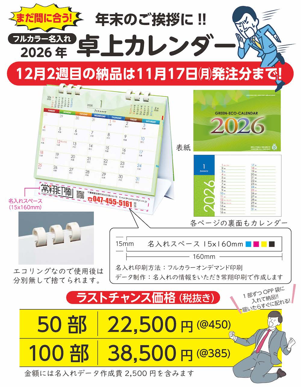 カレンダーメーカーが製造した既製品に企業情報をプリントすることで、高品質・高機能な販促用カレンダーを低コスト・小ロットで作成することができます。